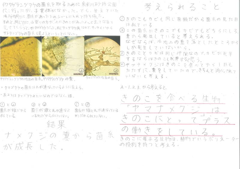 キノコを調べるのに動物に着目した点がおもしろい。また、胞子の形への着目から、その立体模型を作るという発送もとてもよい。幅の広い自由研究です。