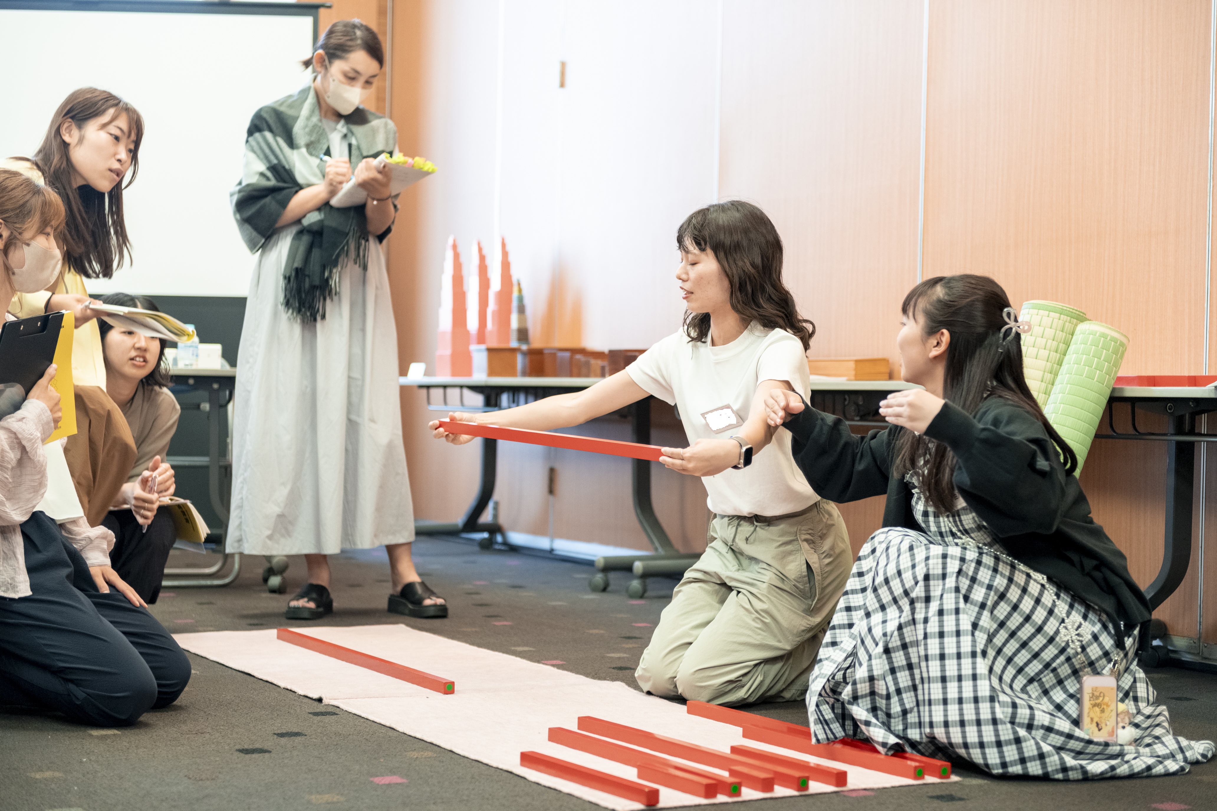 2歳半〜6歳コースの講義は理論と実践の2本柱です。物的環境としての用具、教具類は0歳〜3歳の子どもが対象とする物よりも圧倒的に数が多くなります。また、使い方を行ってみせる「提示」もこの段階の子どもの発達段階に合わせ、段階を踏みながら複雑で手順の多いものになっていきます。したがって、講義内容は理論講義よりも実践講義の比重が高くなります。また、『文化教育』の実践が体系的に紹介される点も当コースの特徴です。